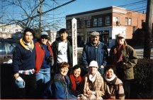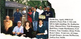 The first thing we did when we moved into our challenged neighborhood was to invite everyone to come over and stand in the center of the triangled three trees that stood in front of the Peace Center to find the vortex of energy where we would plant the new Peace Pole. They could feel the energy and we agreed upon the exact spot. On Earth Day, 1999 we had an official ceremony which this picture shows, complete with a cake and the words "EARTH" on it. Since then, many people have come to have their picture taken here. |